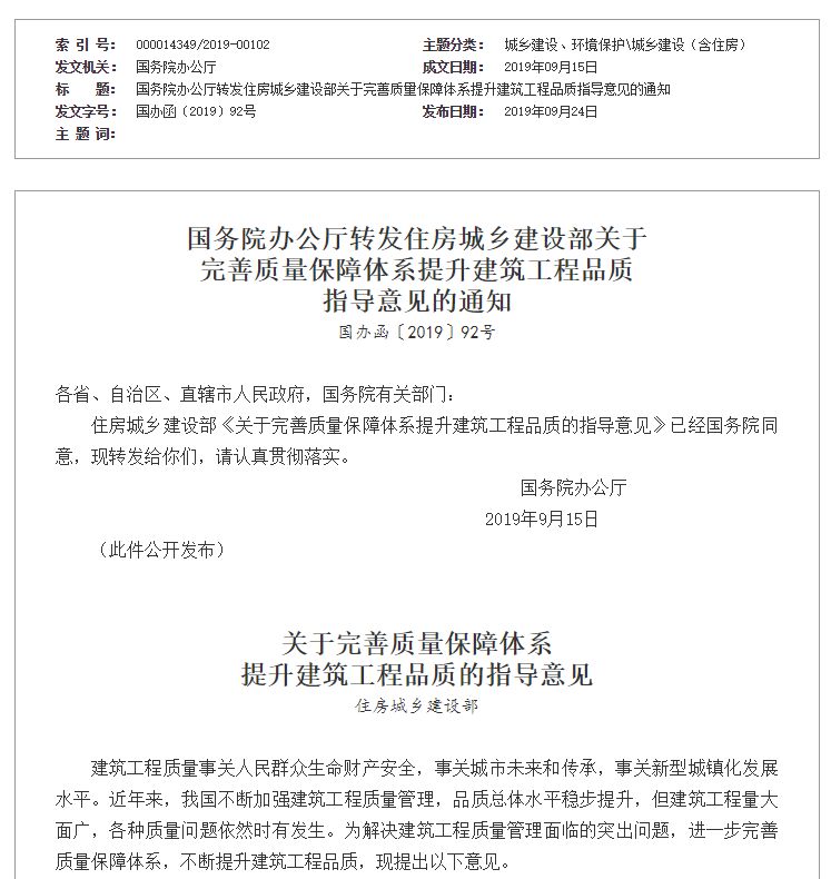 近日,中國政府網公開了國辦函【2019】92號文件,轉發了住建部關于完善質量保障體系提升建筑工程品質的指導意見。文件要求:突出建設單位首要責任。建設單位應加強對工程建設全過程的質量管理,嚴格履行法定程序和質量責任,不得違法違規發包工程。建設單位應切實落實項目法人責任制,保證合理工期和造價。
